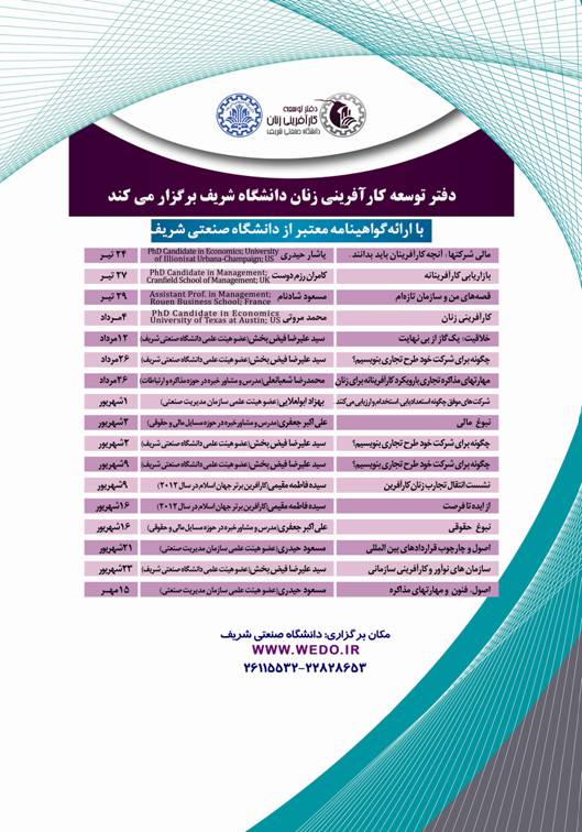 بدينوسيله آغاز بكار و اشتياق و نياز به همكاري «دفتر توسعه كارآفريني زنان دانشگاه صنعتي شريف» را خدمتتان اعلام مينمايم. ضمناً مجموعه اولين فعاليتهاي آموزشي اين دفتر را كه با كمك اساتيد ارزشمند ايراني داخل و خارج از كشور برگزار شود، به پیوست خدمتتان مطرح ميگردد و در صورتی که مایل هستید به طور مرتب از سایر برنامه های دفتر توسعه کارآفرینی زنان، مطلع شوید به stu.wedo@gmail.com یک ایمیل بزنید.